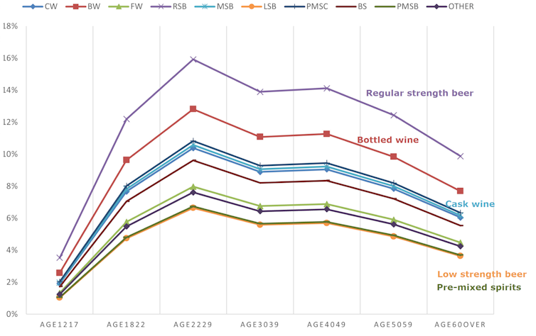 Probability of drink driving, by age and beverage type