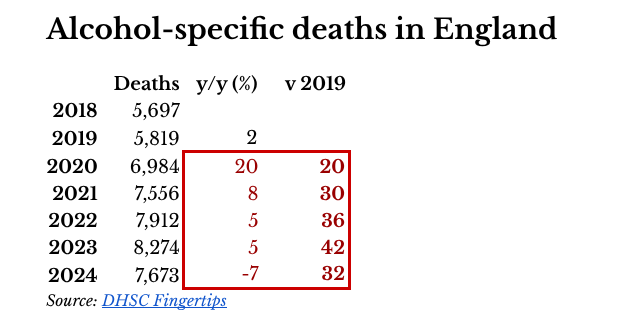 Alcohol deaths in England were 32% above pre-pandemic levels in 2024, despite a 7% fall from the post-pandemic peak the year before, according to new new figures. A total of 38,399 people in England died of causes directly linked to alcohol drinking in the five years to 2024, over 9,304 more than if alcohol-specific deaths had remained at 2019 levels.■